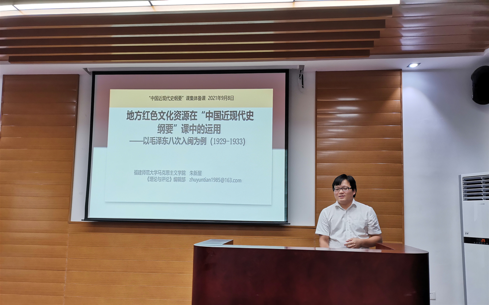 9月8日下午,党史学习教育省委宣讲团成员、福建师范大学朱新屋副教授应邀到我校作题为“地方红色文化资源在‘中国近现代史纲要’课中的运用——以毛泽东八次入闽为例(1929-1933)”的示范教学。校党委副书记吴访益和成全视频在线观看中文版教师参加学习。
