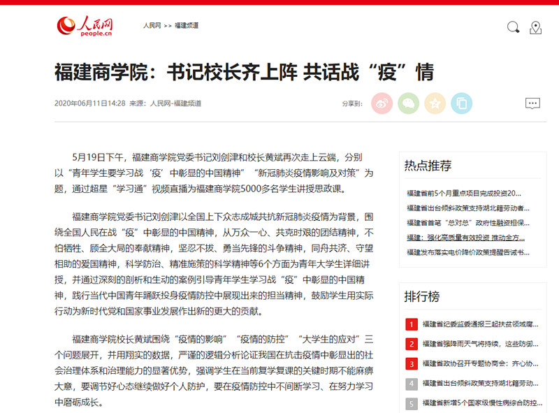 2020年6月11日,人民网以《福建商学院:书记校长齐上阵 共话战“疫”情》为题,报道我校书记校长分别以“青年学生要学习战‘疫’中彰显的中国精神”“新冠肺炎疫情影响及对策”为题,通过超星“学习通”视频直播为我校5000多名学生讲授思政课的特色做法。
