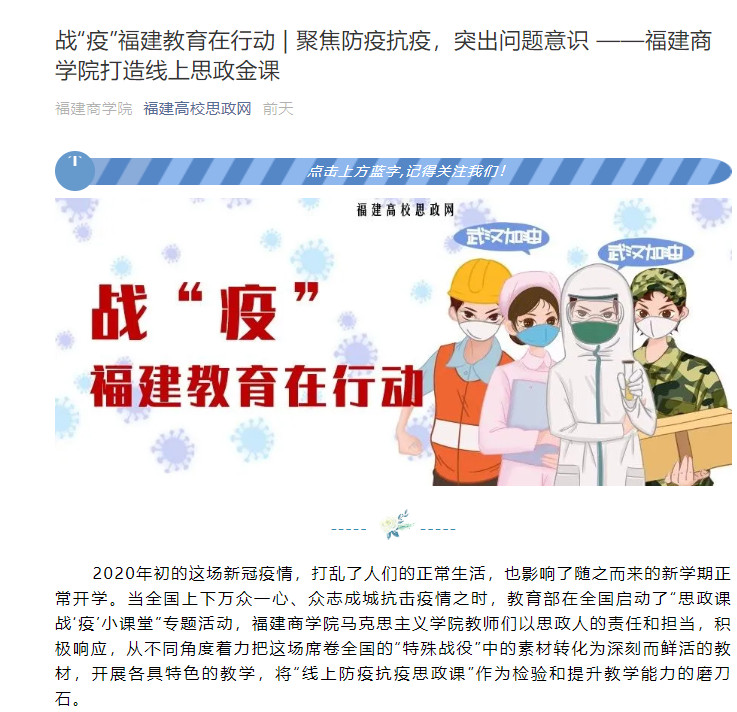 2020年4月11日,福建高校思政网以《聚焦防疫抗疫,突出问题意识 ——福建商学院打造线上思政金课》为题,报道我校成全视频在线观看中文版防疫抗疫期间打造线上思政金课的经验和做法。成全视频在线观看中文版教师们以思政人的责任和担当,在疫情防控期间,从不同学科角度把这场席卷全国的“特殊战役”中的素材转化为深刻而鲜活的教材,开展各具特色的教学,将“线上防疫抗疫思政课”作为检验和提升教学能力的磨刀石,创作寓政治性、思想性、知识性和生动性为一体的中国战“疫”微课堂,成为我院疫情防控期间思政教学亮点和特色。
