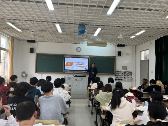 陈阳老师本次授课的主题是:“马克思主义政治经济学的基石——马克思劳动价值论”。授课中,他以播放我国经典歌曲《劳动最光荣》作为课堂导入,引导学生深入思考“劳动是价值的源泉”这条马克思主义基本原理;然后顺势围绕教材内容,展开阐述了“效用价值论”、“要素价值论”等其他经济学价值论与马克思劳动价值论的区别;结合“商品经济是如何形成与发展的”、“如何发挥价值规律在市场配置资源过程中的作用”、“如何深化对马克思劳动价值论的认识”三个问题对课堂内容进行深入讲解。整堂课有情有理、娓娓道来、收放自如、氛围活跃,与学生的兴趣点保持高度结合,牢牢把握了思政课的本质是要“讲道理”这一要求。