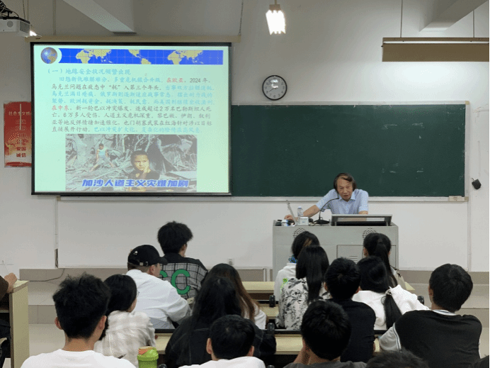 6月6日晚7点30分,福建江夏学院成全视频在线观看中文版郭健彪教授应邀到我校马尾校区远志楼T3教室作题为“当前国际局势与中国式现代化”的专题讲座,校马列经典著作读书社社员、校青马工程班学员共计90多人聆听了讲座。
