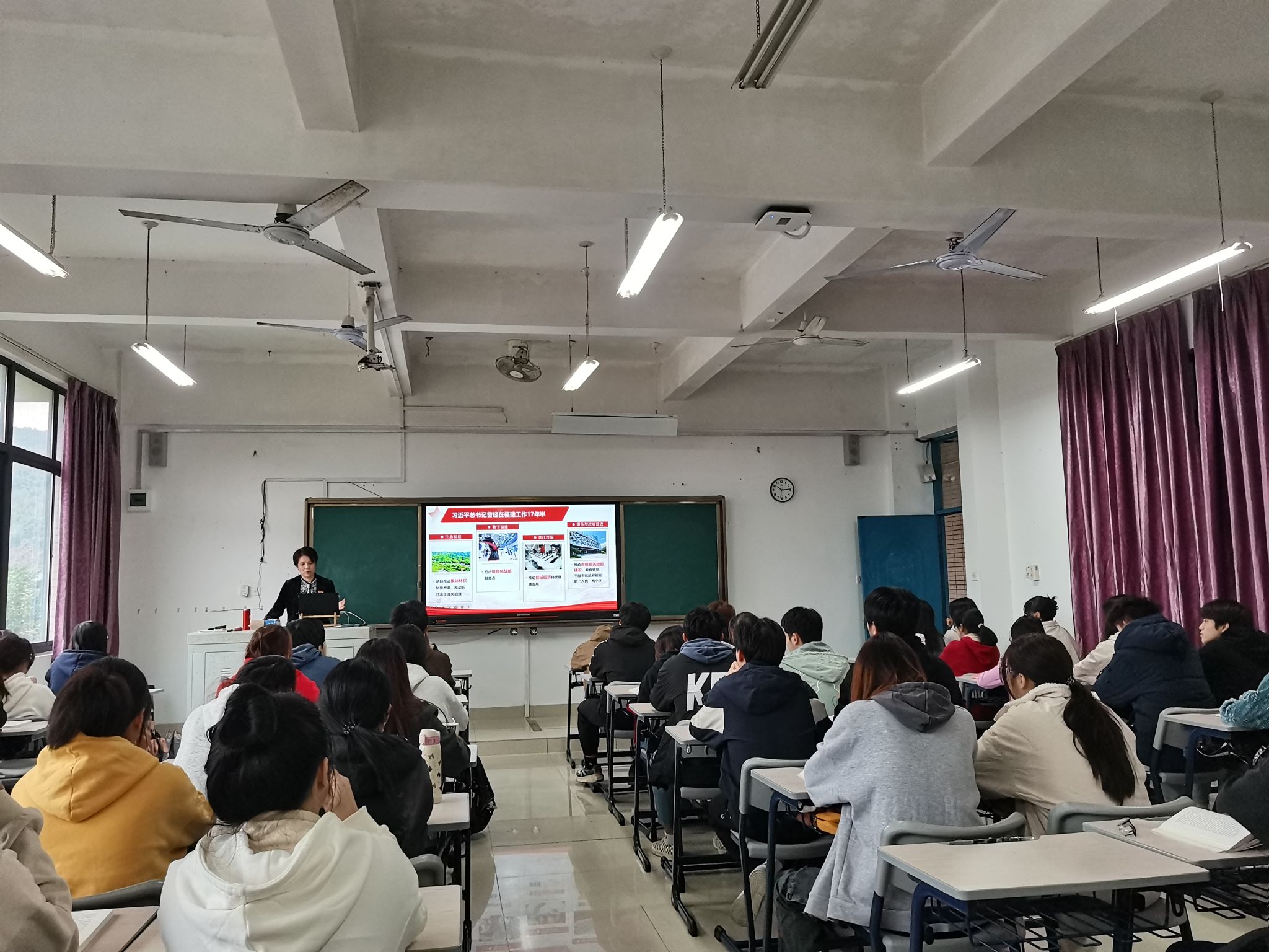 程灵从“深刻领会习近平总书记福建考察重要讲话精神”、“深刻领会中共福建省委十一届七次全会精神”、“奋勇争先:新时代青年的使命担当”三个方面与现场师生进行交流分享。课堂上,首先通过习近平总书记来闽调研的视频,带领学生回忆了习近平总书记在福建工作期间为建设生态福建、数字福建、建设服务型政府等方面作出的重大贡献。其次着重讲述了党的十八大以来,习近平总书记三次到福建考察时的重要讲话精神,先后为福建擘画了“建设机制活、产业优、百姓富、生态美的新福建”宏伟蓝图,以“四个更大”奋力谱写全面建设社会主义现代化国家福建篇章,强调福建要“扭住目标不放松,一张蓝图绘到底,在中国式现代化建设中奋勇争先”。这些重要讲话是指导福建工作的纲领性文献,具有重大政治意义、战略意义、时代意义和实践意义。最后从“筑牢理想信念”、“磨砺过硬本领”、“擦亮艰苦奋斗”三个方面激励青年学生奋勇争先。程灵指出,奋力推动新福建建设再上新台阶,要靠广大青年挺膺担当;实现中华民族伟大复兴的中国梦要靠广大青年矢志作为,践行新时代青年的使命担当。