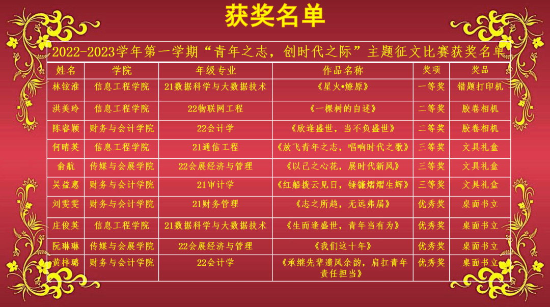 青年是整个社会力量中最积极、最有生气的力量。2023年2月21日,我校习近平新时代中国特色社会主义思想读书社在连江校区诚信楼515活动室举办了2022-2023学年第一学期主题征文获奖学生颁奖仪式,为获奖同学颁发获奖证书。