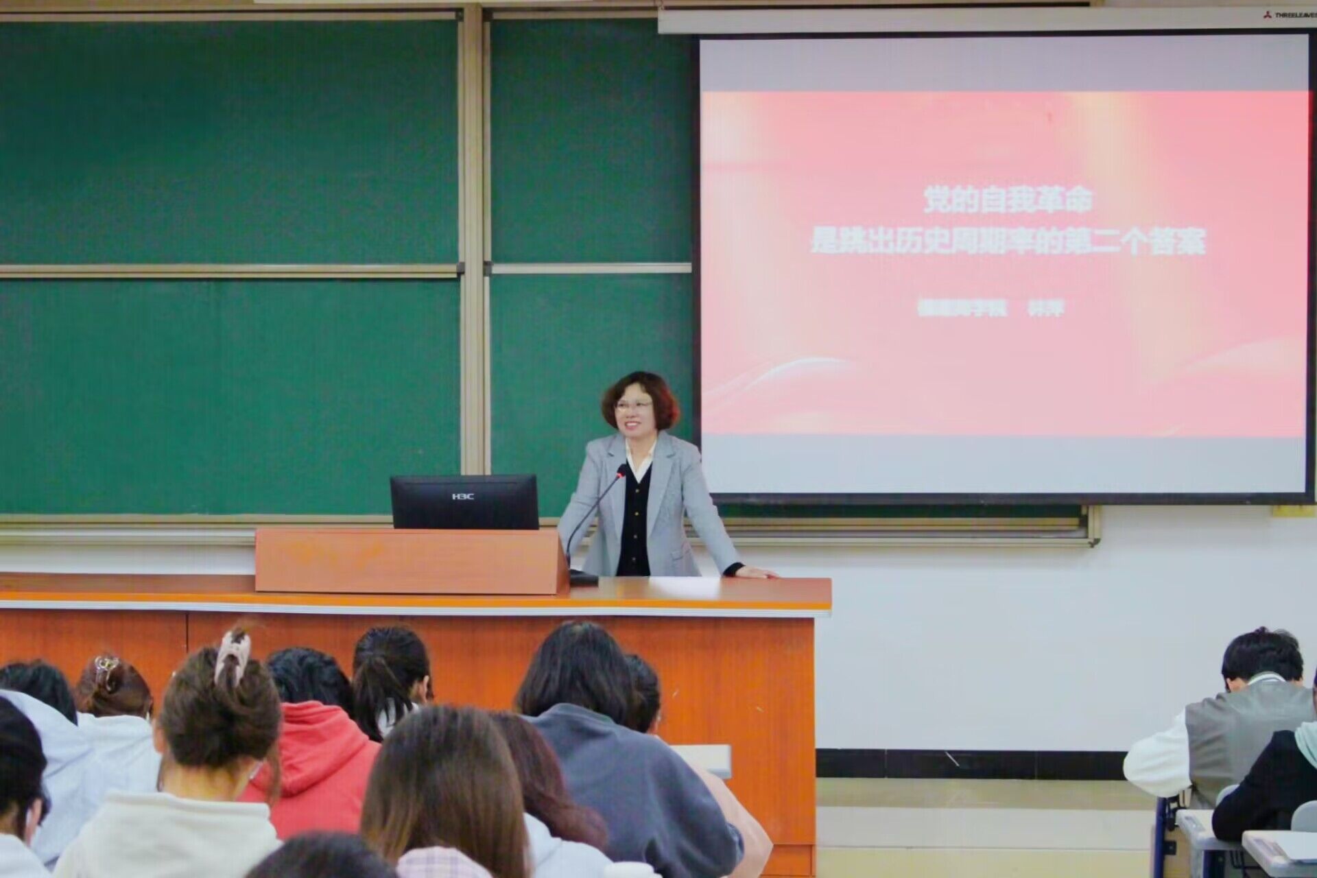 活动伊始,林萍教授围绕“两个答案”的提出、习近平总书记关于“第二个答案”的重要论述等方面进行了深入浅出的讲解,同时也阐述了“九个坚持”的规律性认识和“六个必要”的原则性要求,强调自我革命是党跳出治乱兴衰历史周期率的第二个答案。林萍教授还结合史实资料,生动讲述了党的十八大以来,以习近平同志为核心的党中央深入推进全面从严治党,不断探索、勇于自我革命,最终找到了跳出历史周期率的新路。她强调,自我革命是党百余年来淬炼而成的鲜明品格,是新时代党的建设领域特定内涵的概念。莘莘学子应深刻地认识到党的自我革命的重要性和必要性,坚定为党和国家发展添砖加瓦的信心和决心。
