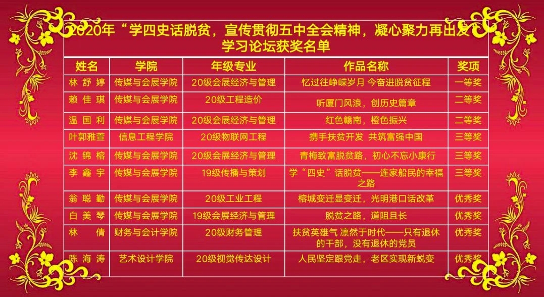论坛以演讲比赛的形式进行,参赛选手围绕主题阐述学习党的十九届五中全会精神、“四史”和《习近平在福建》等系列采访实录的心得体会;讲述农村、农民在党的领导下的脱贫攻坚历史、先进典型以及干部群众扶贫济困的感人事迹、奋斗精神,展现干部群众同心同德共奔小康的良好精神风貌。参赛选手精神饱满,话身边人,道国家事,用一个个感人的小故事展现国家发展的大历史,鼓励、引导青年学子积极投身社会主义现代化强国的建设中,以青春担当创造美好生活。经过将近两个小时的激烈角逐,传媒与会展学院20级会展经济与管理专业林舒婷同学获得本次学习论坛决赛一等奖。活动中,成全视频在线观看中文版院长林萍对比赛作了点评并针对丰富学习论坛形式等提出建议。
